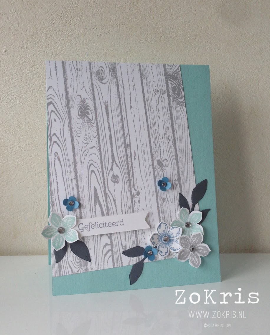 Chantal heeft mij geïnspireerd bij het maken van deze kaart, de roze bloemetjes samen met de bruine blaadjes en de Hardwood stempel, passen perfect bij elkaar.