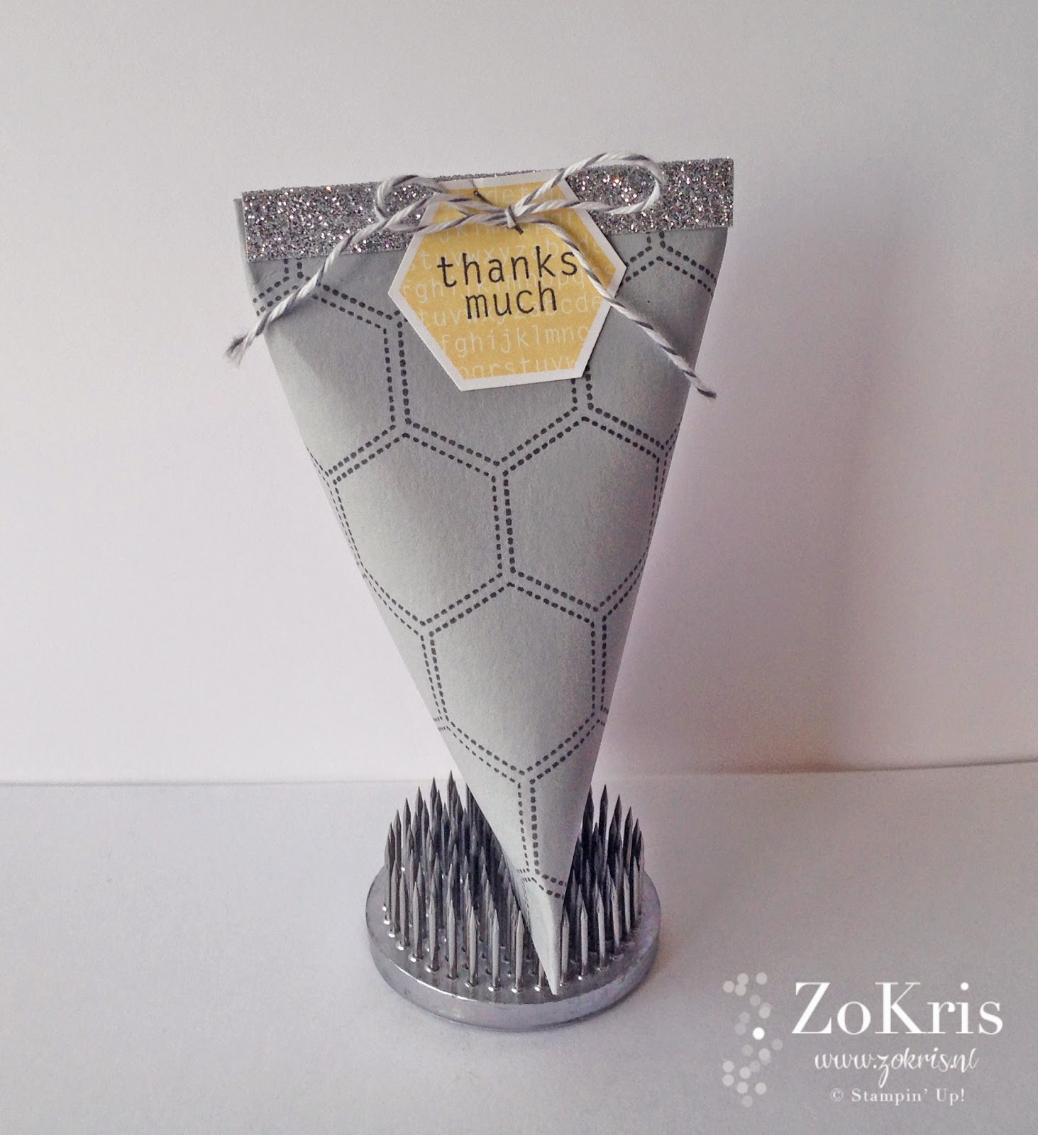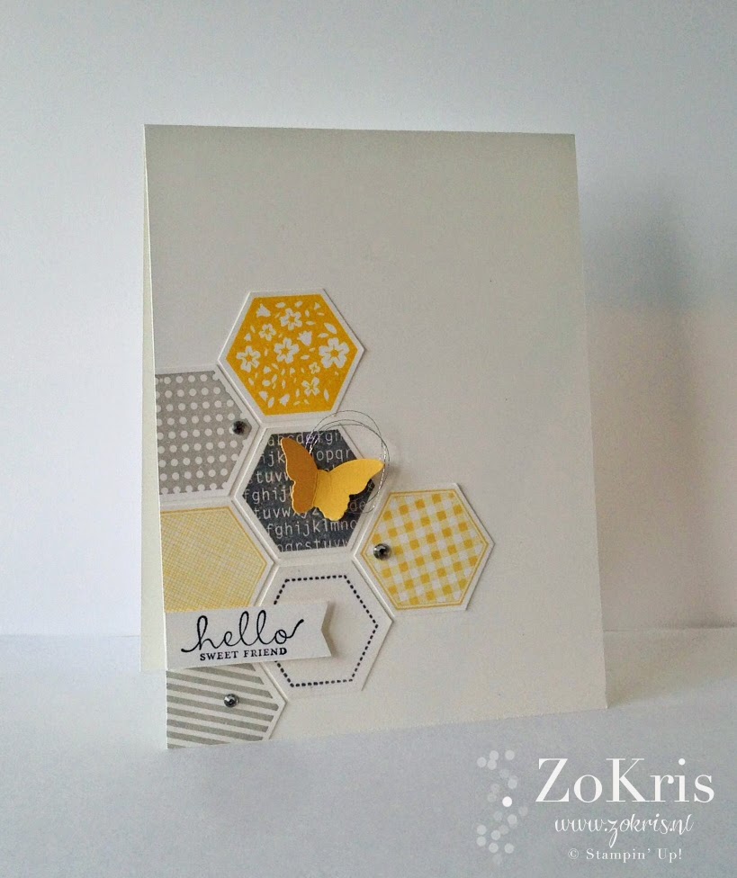 Hallootjes ! Laatst, bij het doorbladeren van de annual catalogus viel mijn oog op deze creatie. In de catalogus zijn er andere kleuren gebruikt, maar ik vond 'm zo leuk dat ik 'm gewoon gecased heb. Wel in mijn nieuwste favo combi : geel en grijs. Met een beetje zilver.